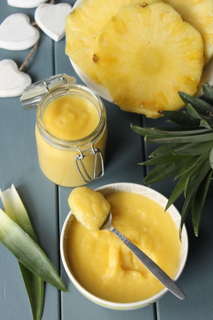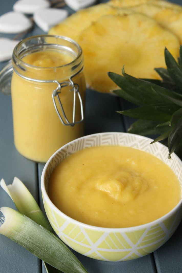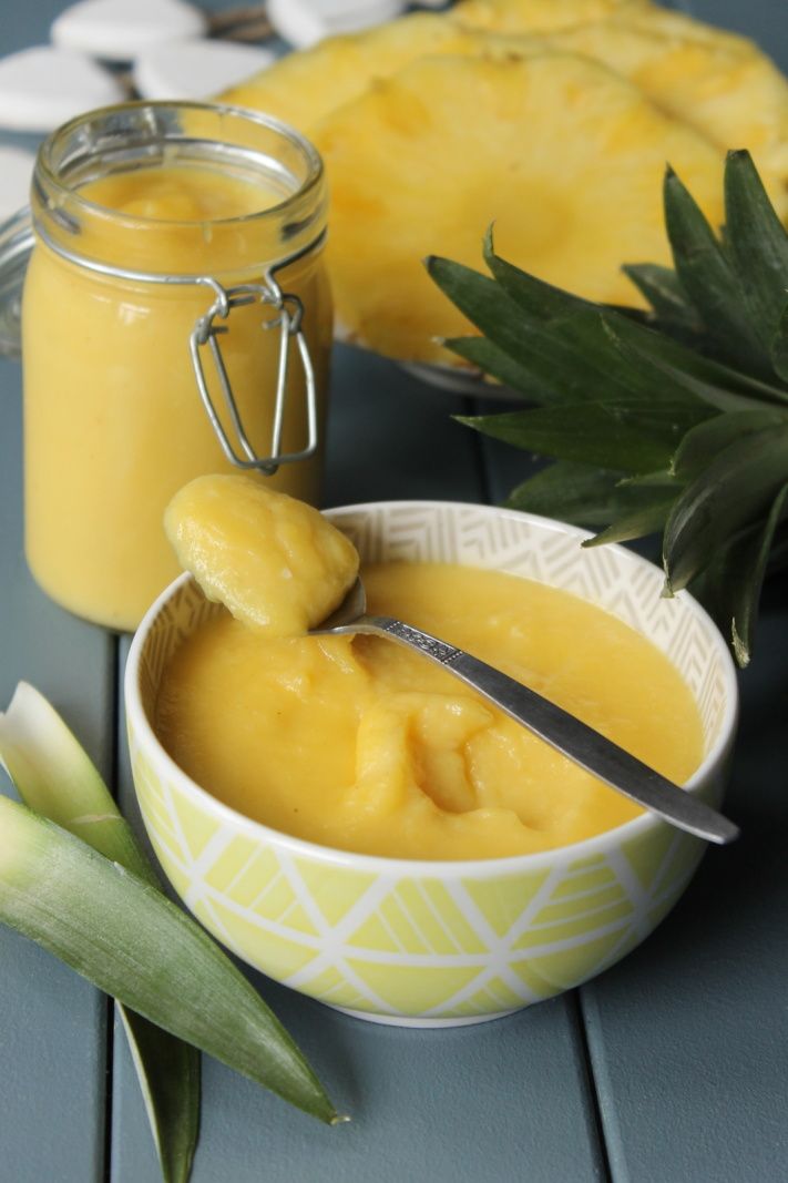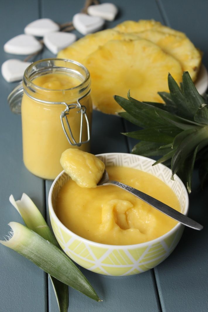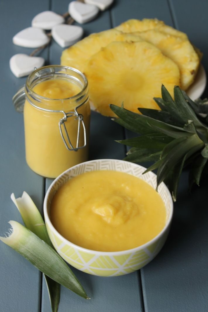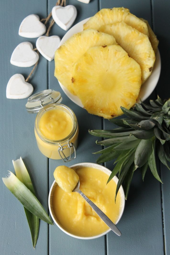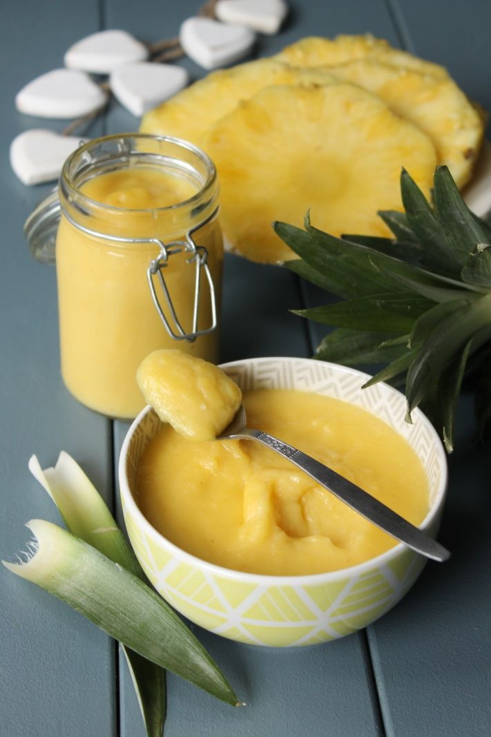 Me restant un bel ananas, j'ai eu dans l'idée d'en faire une crème qui je pense on pourrait aussi appeler curd (pineapple cure dans ce cas) puisqu'il s'agit d'une crème lisse, onctueuse et parfumée que l'on peut tartiner sur des tartines, des crêpes, des gaufres, des scores etc..